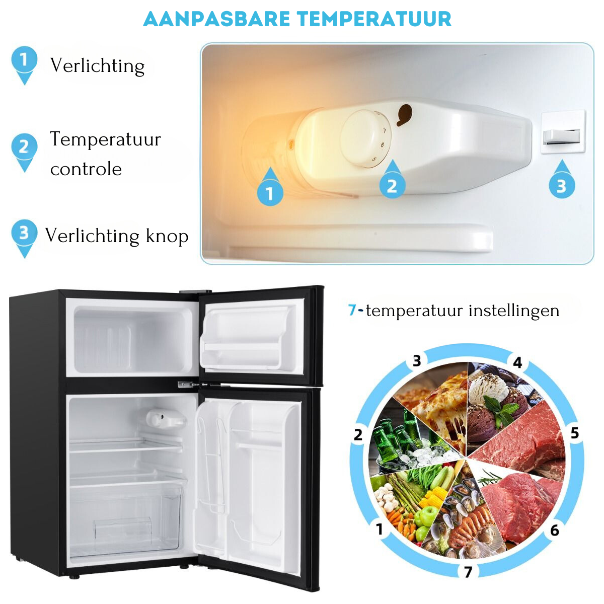 Ja, deze koelkast heeft 7 koeltemperaturen instelbaar binnen 0℃-10℃, zodat u de temperatuur kunt aanpassen om uw voedsel vers en heerlijk te houden voor langere tijd.