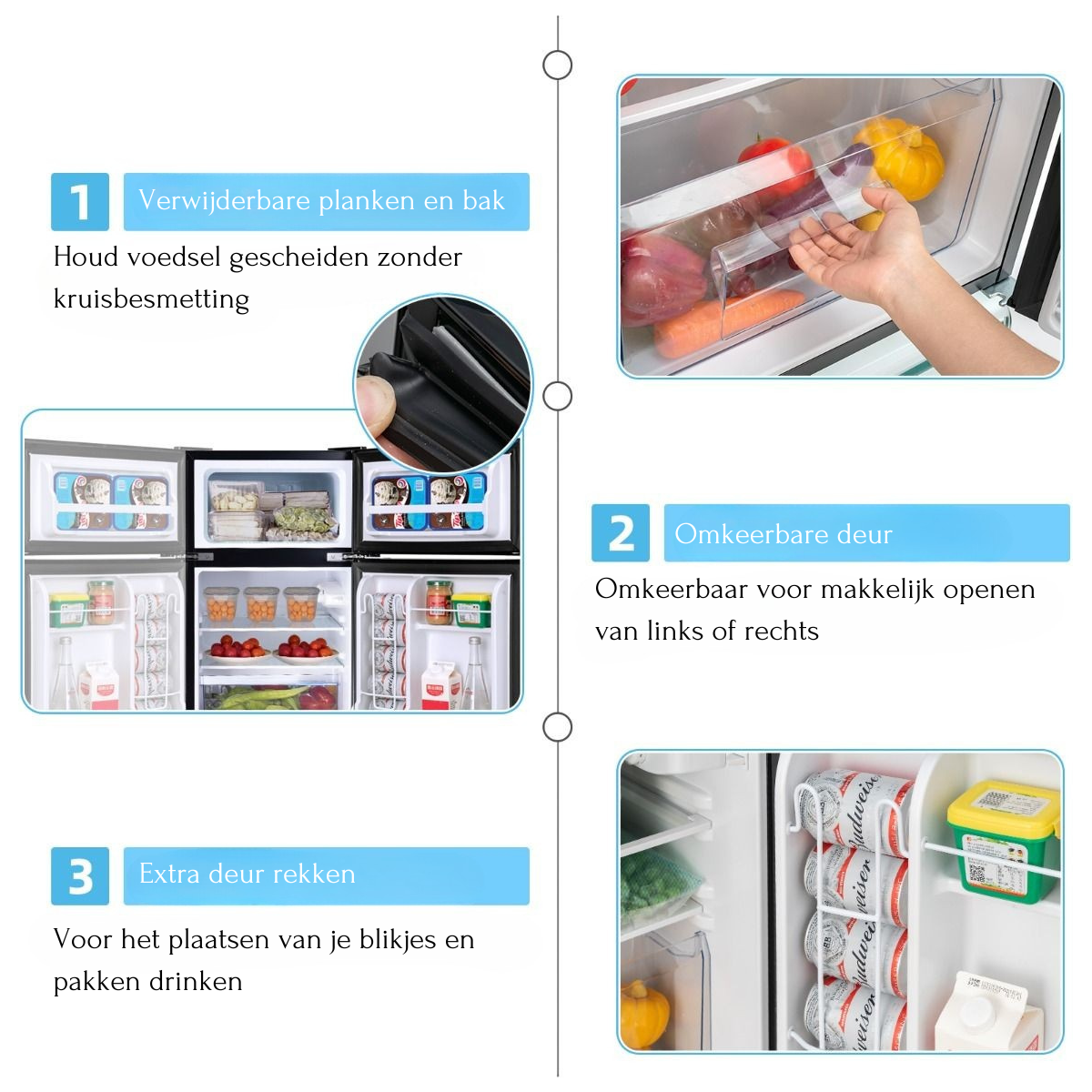 - Ruime opslagmogelijkheden voor diverse soorten etenswaren en drinken.