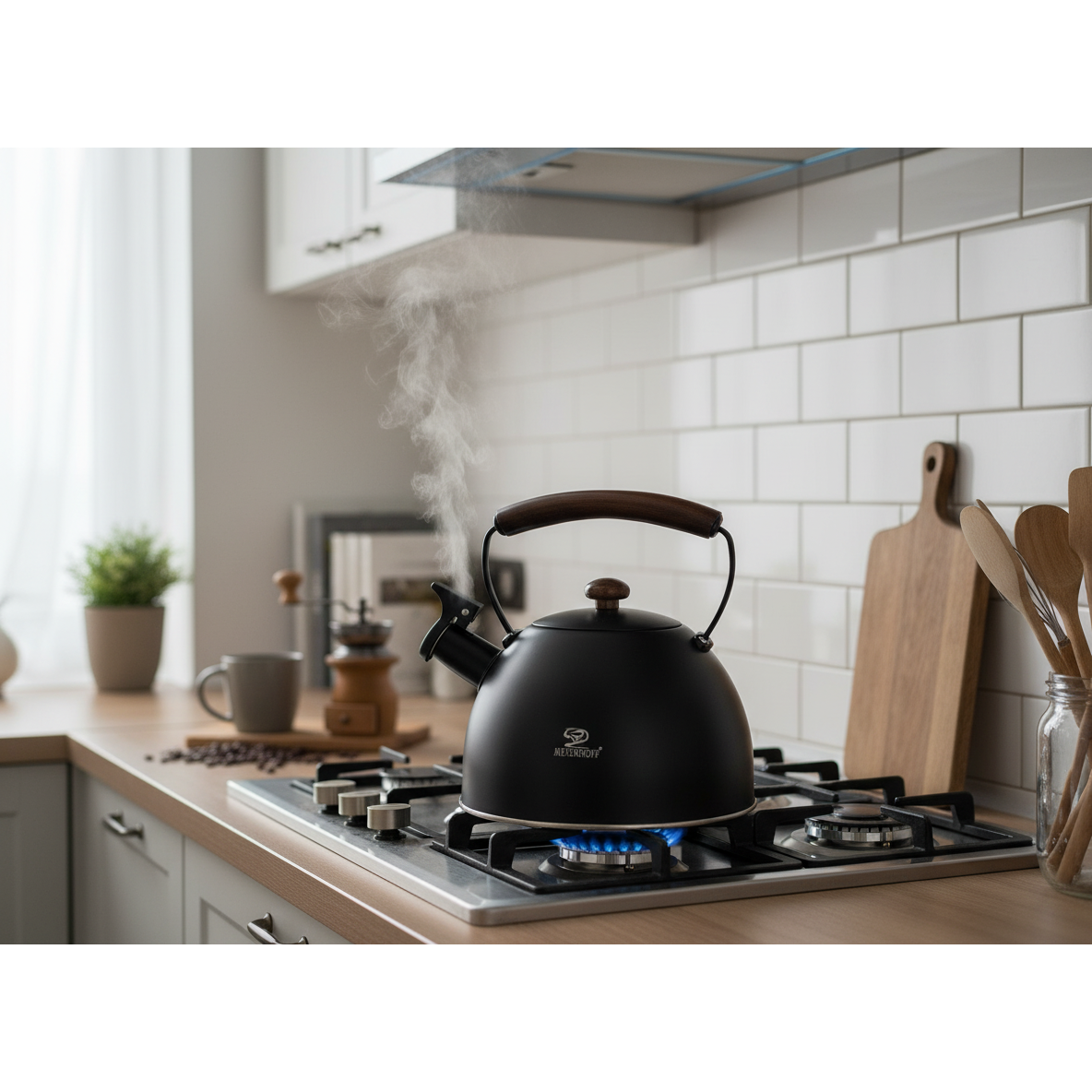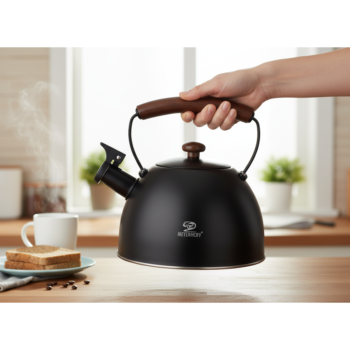 Met deze Meyerhoff fluitketel van 2,5 liter, gemaakt van hoogwaardig roestvrij staal (RVS) in mat zwart, combineer je stijl en functionaliteit. Dankzij de solide bodem en degelijke afwerking is hij geschikt voor alle warmtebronnen — gas, elektrisch, keramisch én inductie. De houten handgreep blijft koel in de hand en het fluitje waarschuwt je wanneer het water kookt. Ideaal voor jouw dagelijkse kop koffie of thee, zonder gedoe.