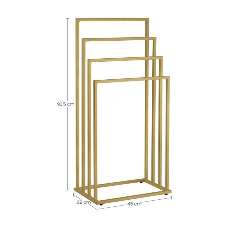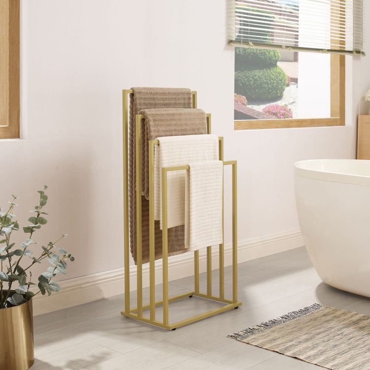 De stalen constructie met matte gouden afwerking straalt luxe uit en past perfect in moderne, klassieke of hotelstijl interieurs. Met vier ophangniveaus is er volop ruimte voor handdoeken, badlakens en kledingstukken. Omdat het rek volledig vrijstaand is, hoef je niets te bevestigen aan de muur – verplaats het eenvoudig waar je wilt.