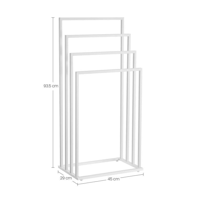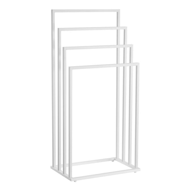 Gemaakt van stevig staal met een matte witte afwerking, past dit handdoekenrek perfect in elke badkamer, wasruimte of thuisspa. Met vier ophangniveaus heb je voldoende ruimte voor handdoeken, kledingstukken of zwemkleding. Omdat het rek volledig vrijstaand is, hoef je niet te boren en kun je het eenvoudig verplaatsen of herpositioneren wanneer je wilt.